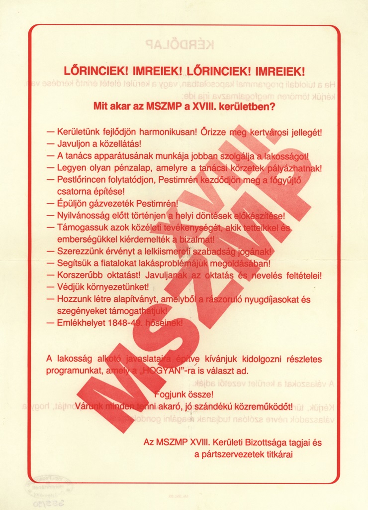 - az M0-ás körgyűrű nyomvonala, majd később elkészülése, ami már a rendszerváltáskori kampánytémák sorában is szerepelt,