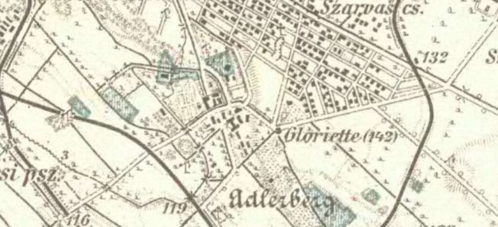 Ugyanis az 1880-as években a Gloriette-től délre eső telkeket[22] Cséry Lajos szőlőbirtokoknak parcellázta, a hatvan darab 800 négyszögöles birtokból vásárolt többek között Lónyay Menyhértné szentlőrinci villatulajdonos, Göttmann Károly gazdatiszt, illetve Krepuska Lajos, Krepuska Géza öccse.[23] Ettől délre, a 140 méter magas, korábban Lúdhegynek (Gansberg), majd Sashegynek (Adlerberg) nevezett részen Cséry kavicsbányát nyitott – 1934-ben ebben a kavicsbányában, mely ekkor a Varjú család tulajdonában volt, egy megkövesedett hajóroncsot találtak. 1939-ben a kavicsbányát Kispest város vásárolta meg.[24] A Gloriette-től északra, a mai Petőfi utca, Cziffra György utca és Varjú utca által határolt területen szintén szőlőültetvények voltak, melyeket 1903-ban Varjú Kálmán kispesti birtokos vásárolt meg.