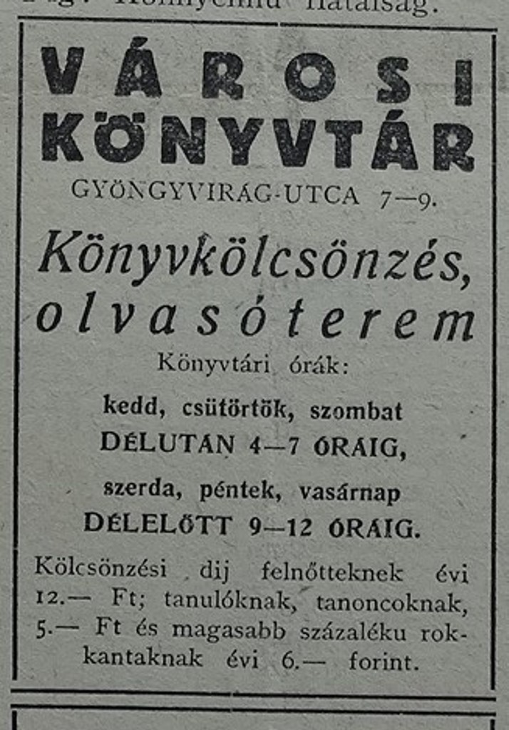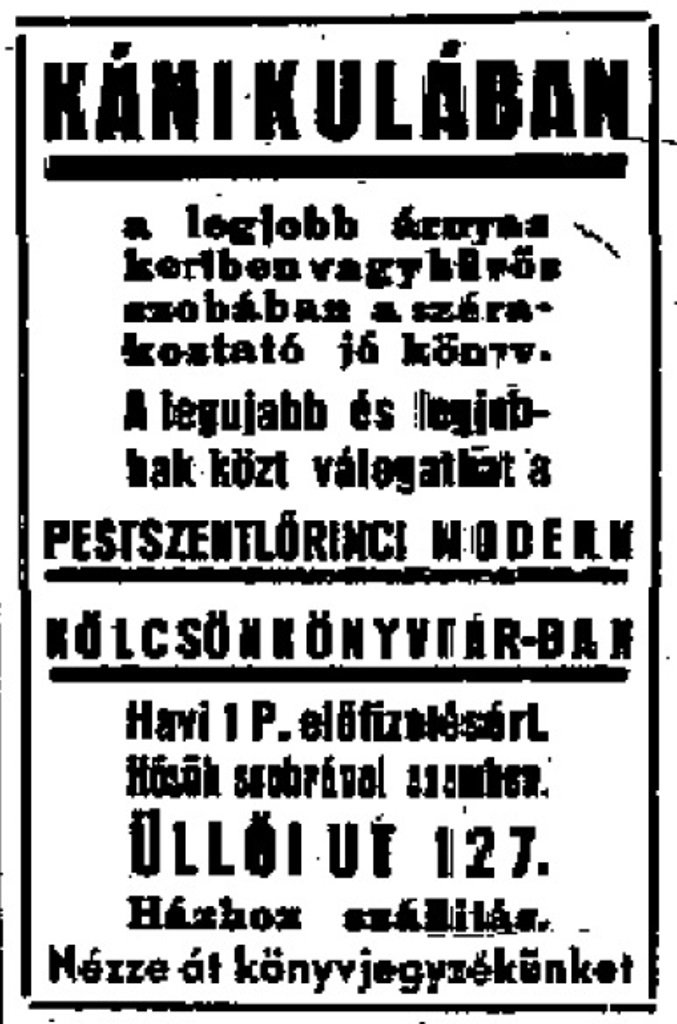 [13] Egy hirdetés feltételezi, hogy 1925-ben az Állami lakótelep 42. számú épületében is működött már kölcsönkönyvtár egy könyv- és papírkereskedés keretében. Pesti Hírlap, XLVII. évf. 28. sz. 1925. február 5. 18. o.