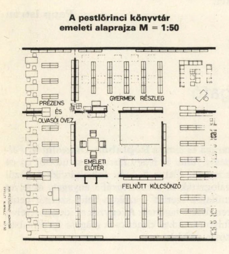 „Fehér falak, neonfény, gázfűtés, szürke műanyagpadló, világos könyvállványok. Legfelső, a kis olvasóknak nehezen elérhető polcaikon kerámiák, földgömb, virág. A bejáratnál jobbról a kölcsönzőpult, balról a katalógusszekrény.”[64]