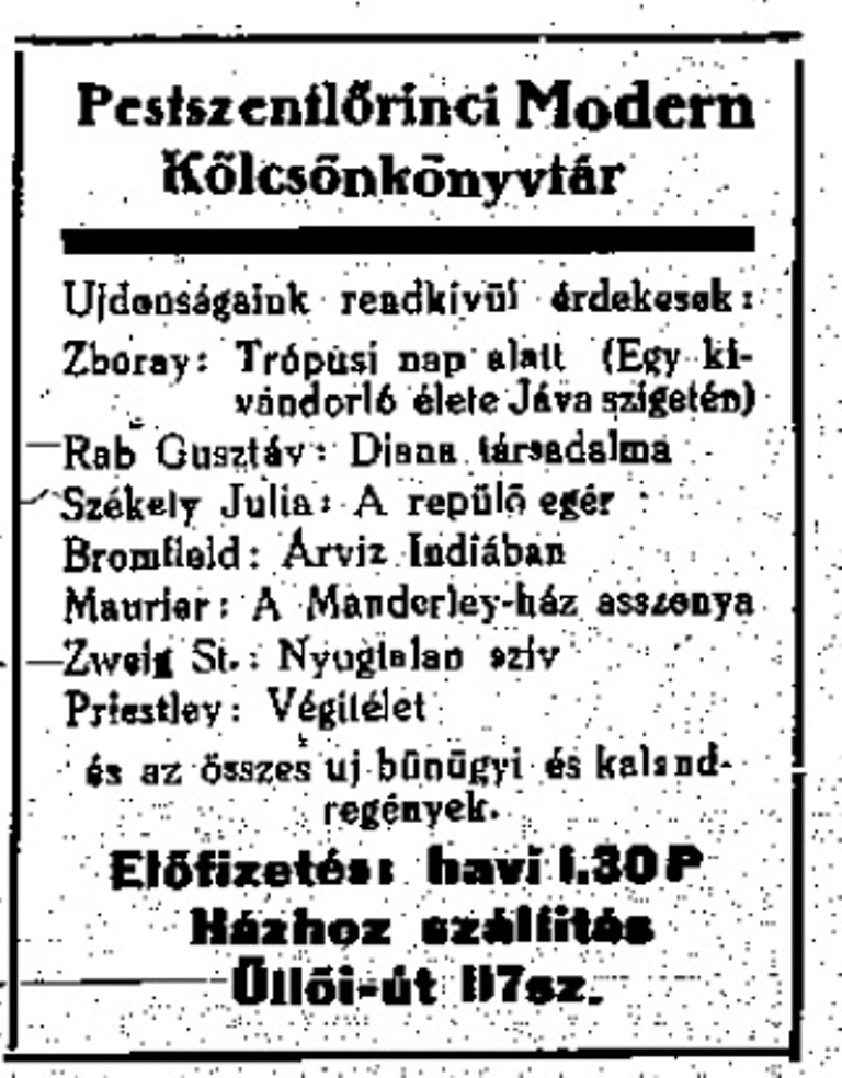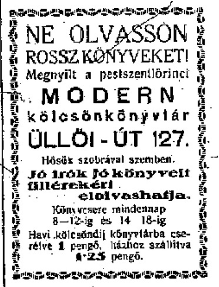 1934. április elején nyílt meg a Pestszentlőrinci Modern Kölcsönkönyvtár az Üllői út 127. (ma Üllői út 447 és 449.) alatt.[13] „A kölcsönkönyvtárban több mint 1500 válogatott könyv áll az olvasók rendelkezésére, váltogatva a legjobb magyar és külföldi írók műveivel. A könyvtár tulajdonosa figyelemmel volt a nehéz gazdasági viszonyokra is, ezért a tagsági díjat olyan minimális összegben állapította meg, hogy szinte mindenki részére hozzáférhetővé tette a magyar és külföldi irodalom legremekebb könyveinek olvasását.”[14] A kölcsönzési díj havi egy pengő volt, minden nap nyolc órát tartott nyitva a könyvtár, de már kezdettől lehetőség volt házhoz szállítást kérni.[15] A „fővárosi nívót fenntartó könyvállománnyal rendelkező”[16] könyvtár tulajdonosára sajnos a sajtóból nem derült fény. 1937. november 1-jén a kölcsönkönyvtár az Üllői út 117. (ma Üllői út 435.) szám alá költözött, ahol megnagyobbított kínálattal várta az olvasókat. 1945. április 14-én a a kölcsönkönyvtár folytatója, a Demokratikus Könyvtár az Üllői út 113. alatt nyílt meg.[17]