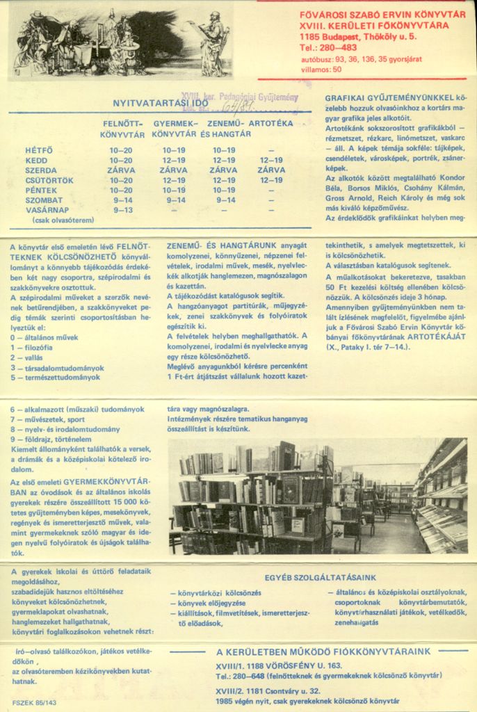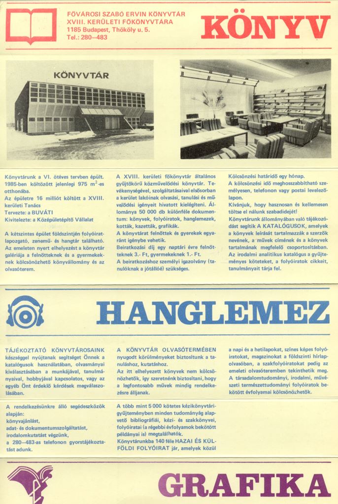 A Fővárosi Szabó Ervin Könyvtár XVIII/2. számú gyermekkönyvtárának megnyitójára a Gyermekkönyvhét alkalmából 1985. december 4-én került sor, a megnyitó beszédet Szőllősy Antalné, a kerületi Tanács VB elnökhelyettese mondta.